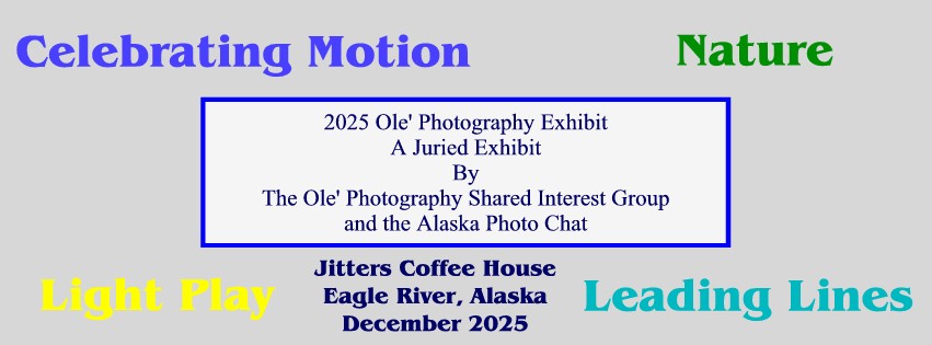 The 2024 Ole Photo SIG Show has been hung in Jitters (in Eagle River) and will on display for whole the month of December 2024. This year, the show is open to all Anchorage Ole' members and participants in the Alaska Photo Chat. Head out to Eagle River and visit the show. The images look better in real life.